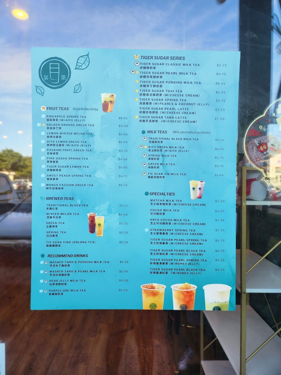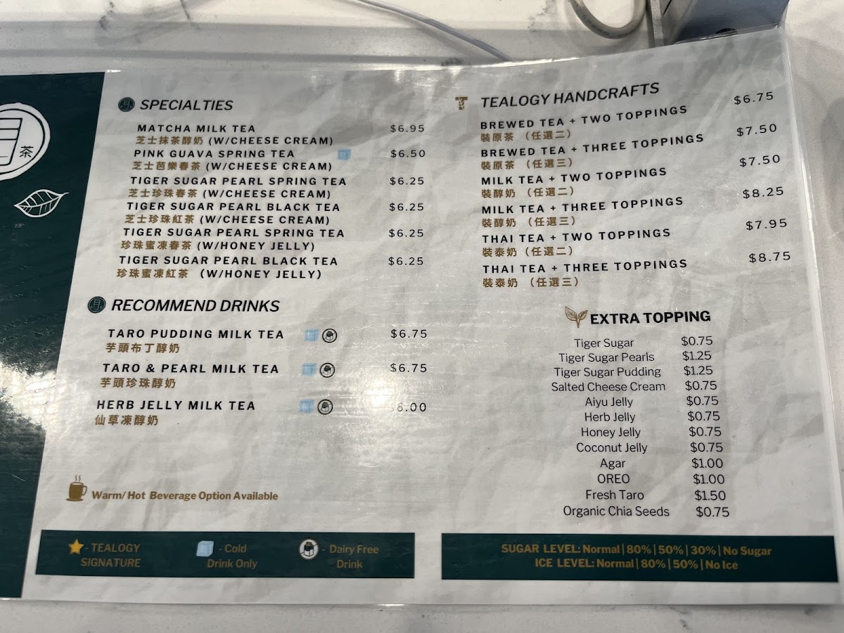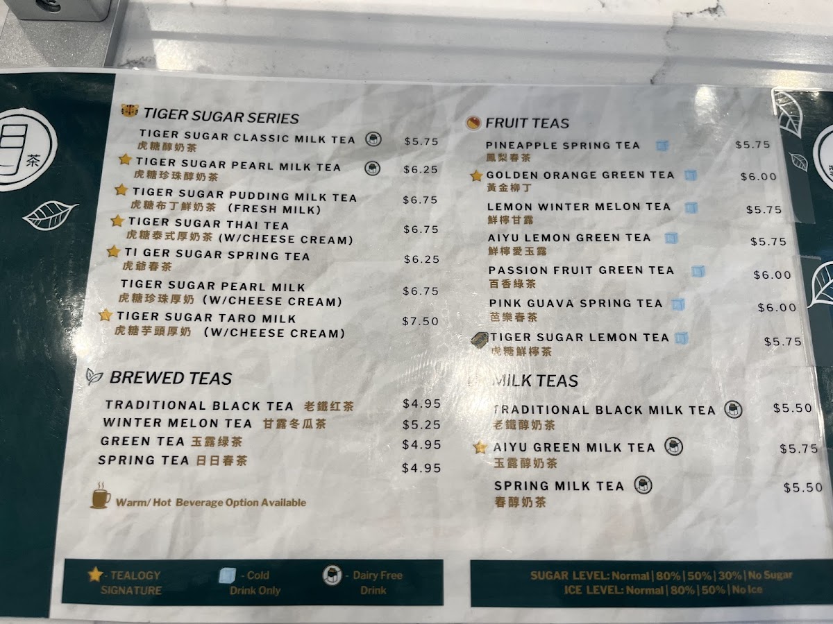 From a reviewer’s perspective, the menu at Tealogy 日日裝茶 offers a well-rounded and creative selection of drinks and light desserts, even though specific prices are not prominently listed. The standout SIGNATURE TIGER SUGAR series features rich options like Tiger Sugar Classic Milk Tea, Tiger Sugar Pearl Creamy Milk, and Tiger Sugar Taro Creamy Milk, all delivering a satisfying balance of sweetness and creaminess. For those who prefer simpler flavors, the CLASSIC BREWED TEAS such as Jasmine Green Tea and Tie Guan Yin Oolong Tea provide a clean, aromatic experience. The MILK TEAS and FRUIT TEAS categories expand the variety further with refreshing choices like Aiyu Lemon Green Tea and Mango Passion Green Tea. More indulgent options appear in the SPECIAL SERIES, including Matcha Milk Tea w/ Cheese Foam and Oreo Cocoa Milk Tea w/ Cheese Foam, which feel like dessert in a cup. The nostalgic WINTERMELON SERIES adds a traditional touch with drinks like Winter Melon Milk Tea. For something icy, the BLENDED DRINKS such as Mango Slushy (24 OZ) and Pink Guava Cream Shake (24 OZ) are refreshing picks, while coffee lovers can opt for the T-Sugar Iced Coffee Latte (24 OZ). Finally, the dessert menu-featuring items like Chocolate Chunk Cookie and Mochi Tiger Paw - Nutella-rounds out the experience nicely. Overall, the menu impresses with its variety and creative combinations, catering to both classic tea enthusiasts and adventurous drink lovers.