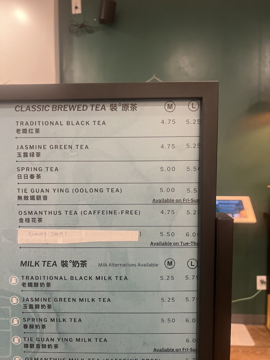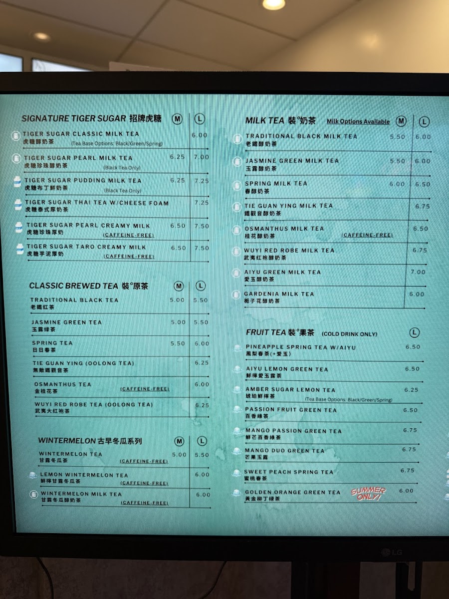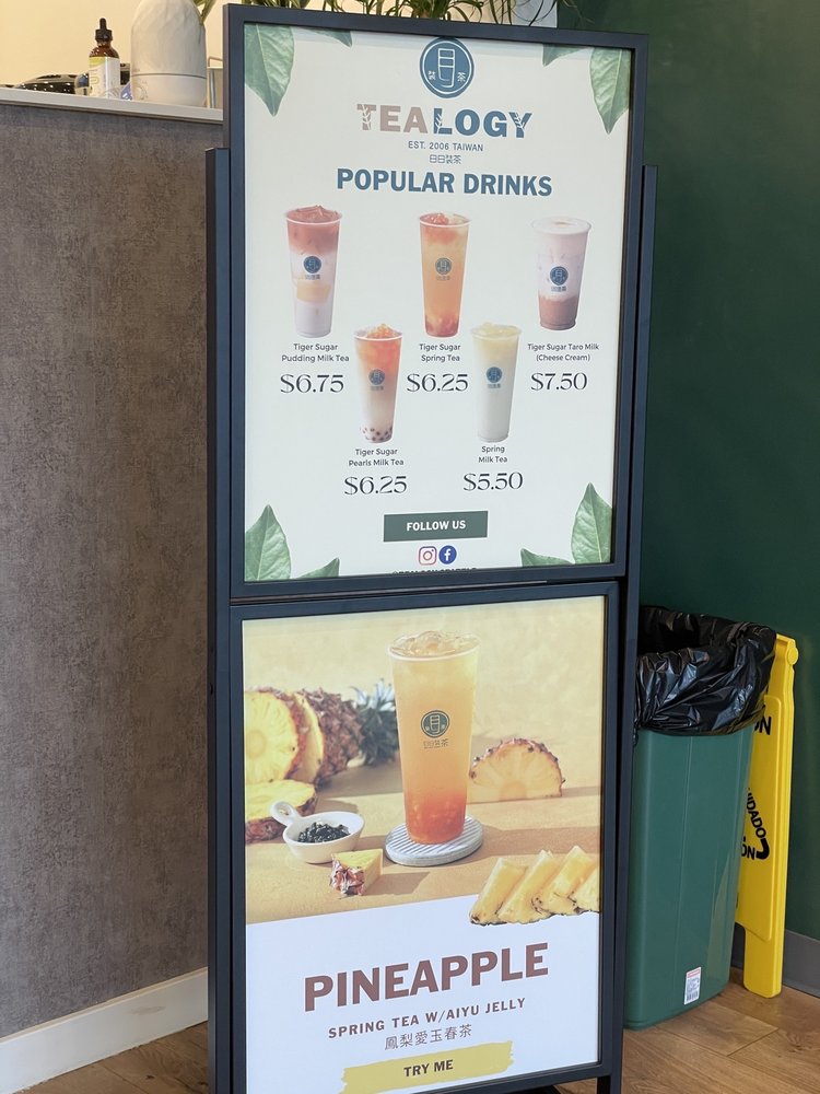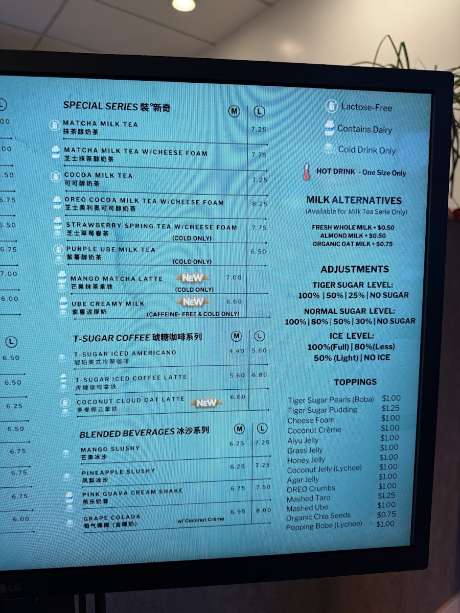 From a reviewer’s perspective, the menu at Tealogy 日日裝茶 offers a well-rounded and creative selection of drinks and light desserts, even though specific prices are not prominently listed. The standout SIGNATURE TIGER SUGAR series features rich options like Tiger Sugar Classic Milk Tea, Tiger Sugar Pearl Creamy Milk, and Tiger Sugar Taro Creamy Milk, all delivering a satisfying balance of sweetness and creaminess. For those who prefer simpler flavors, the CLASSIC BREWED TEAS such as Jasmine Green Tea and Tie Guan Yin Oolong Tea provide a clean, aromatic experience. The MILK TEAS and FRUIT TEAS categories expand the variety further with refreshing choices like Aiyu Lemon Green Tea and Mango Passion Green Tea. More indulgent options appear in the SPECIAL SERIES, including Matcha Milk Tea w/ Cheese Foam and Oreo Cocoa Milk Tea w/ Cheese Foam, which feel like dessert in a cup. The nostalgic WINTERMELON SERIES adds a traditional touch with drinks like Winter Melon Milk Tea. For something icy, the BLENDED DRINKS such as Mango Slushy (24 OZ) and Pink Guava Cream Shake (24 OZ) are refreshing picks, while coffee lovers can opt for the T-Sugar Iced Coffee Latte (24 OZ). Finally, the dessert menu-featuring items like Chocolate Chunk Cookie and Mochi Tiger Paw - Nutella-rounds out the experience nicely. Overall, the menu impresses with its variety and creative combinations, catering to both classic tea enthusiasts and adventurous drink lovers.